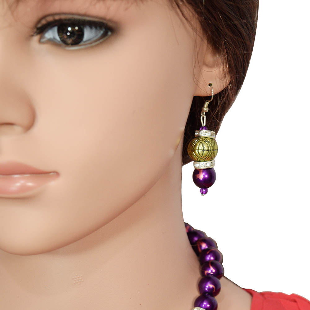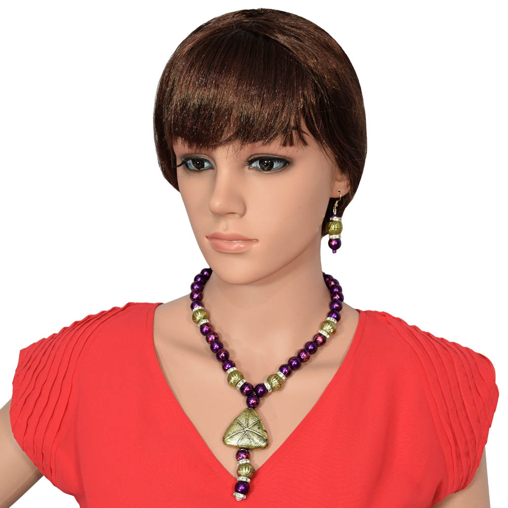 If you love purple color then this necklace is exactly for you. The silver colored antique beads and a triangle shaped pendant make it a unique accessory. Purple colored round beads make it very attractive. The necklace and earrings also contain rings studded with stones. The earrings are simple yet attractive.