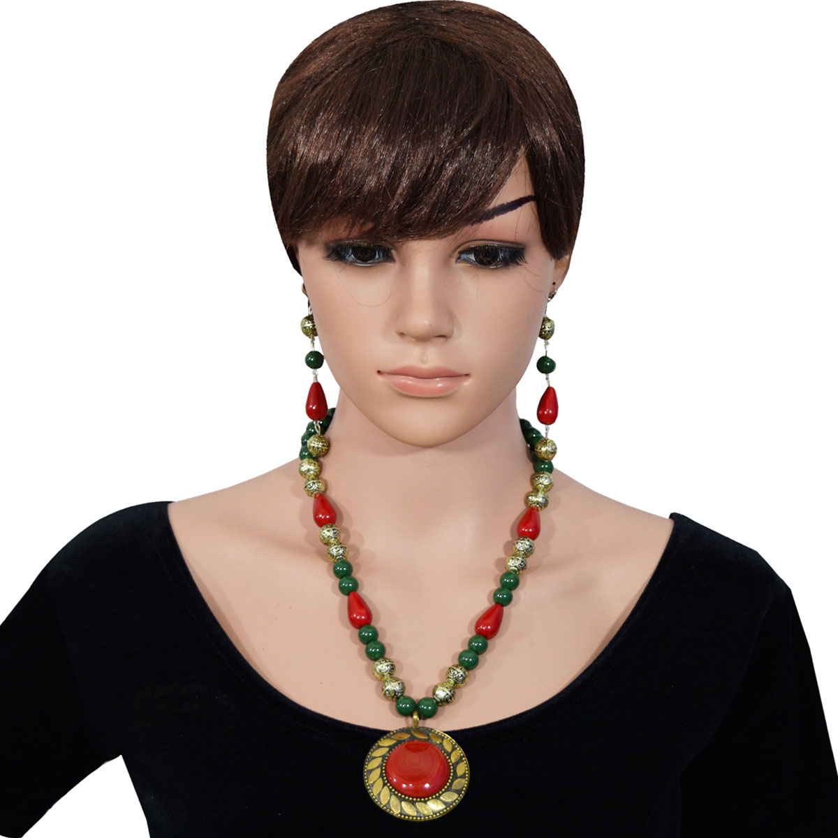 A uniquely delicate and best-looking styled handmade necklace made of green and red beads looks stunning. With a big red bead, the pendant looks alluring in the center of the necklace. This necklace comes with a pair matching of earrings. It can only be imagined this on some special girl's neck on her day of being the center of attraction! The look of this necklace is simple yet very beautiful. This piece is a hundred percent hand-decorated. so grab this antique beads necklace now!
