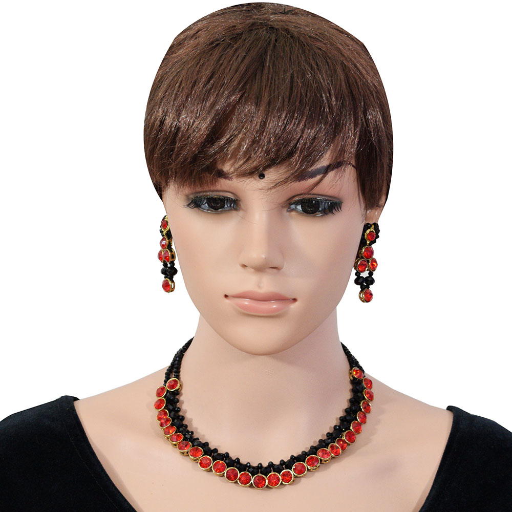 You surely do not want to miss this vintage beauty from the house of Fashionvalley. Intricately crafted with black crystal and red kundan beads, this has a touch of rare sophistication. Get heads turning at the party when you adorn it with any silk saree or suit of your choice. The drop-shaped dangling matching earrings will complete your formal look and is sure to sway one and all. SKU FV00647
