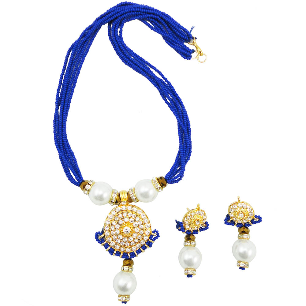 Your rich golden or blue colored attire will get the best partner if you adorn yourself with this beautiful necklace. This rich necklace is made using small blue colored beads. Multiple threads strung with beautiful blue beads have been used to form this chic necklace. The center of attraction in this set is a round pendant studded with diamond stones. Its shine will definitely draw multiple viewers to your necklace. The white pearls added in the middle of the necklace reflect its chastity. The earrings also contain the pendant design as well as the white pearls.