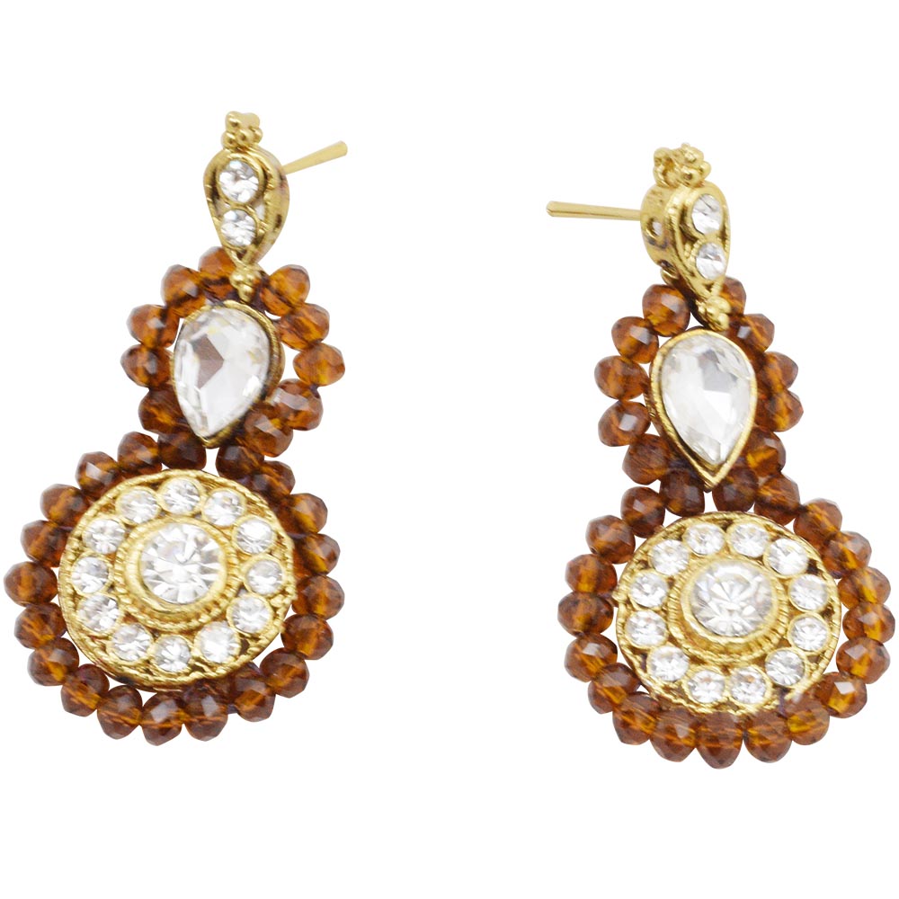 Add a subtle touch of sparkle with this vintage, two-layered chunky chain bead-Kundan set. When you adorn this, we are sure that you'll make other girls envy because we bring you a classic statement jewel necklace. To accentuate your look altogether, this necklace comes with a pair of brown bead studded earrings. The eye-catching finish makes this jewellery all the more worth having.