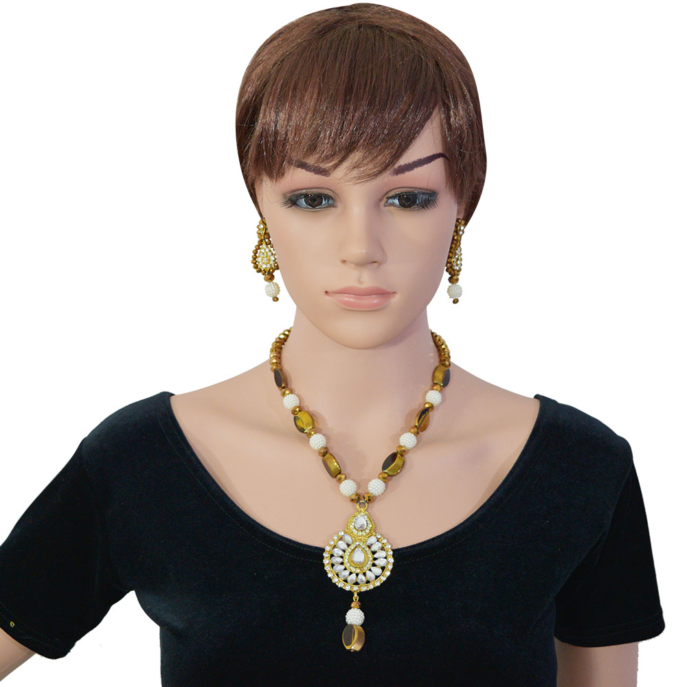 This beautifully and intricately crafted beaded and kundan necklace is sure to amaze you and your onlookers. You will get this gold and white finish stunning neck piece with a pair of drop earrings. When you wear it, be ready to become the Queen of the Tinsel Town!