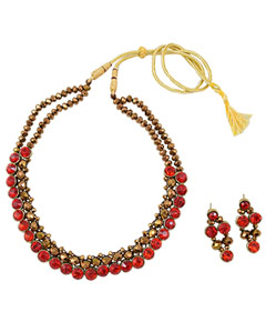 This copper beads necklace is perfect if you are aiming for simple yet striking bold look as the dual-layered necklace is encrusted with dainty red kundan below it. Entrance everyone with this one-of-a-kind elegant women's necklace set. Works perfect when you have to attend a low-key affair and do not want to wear a heavy neckpiece. For maximum brilliance, wear it with fusion or ethnic wear.
