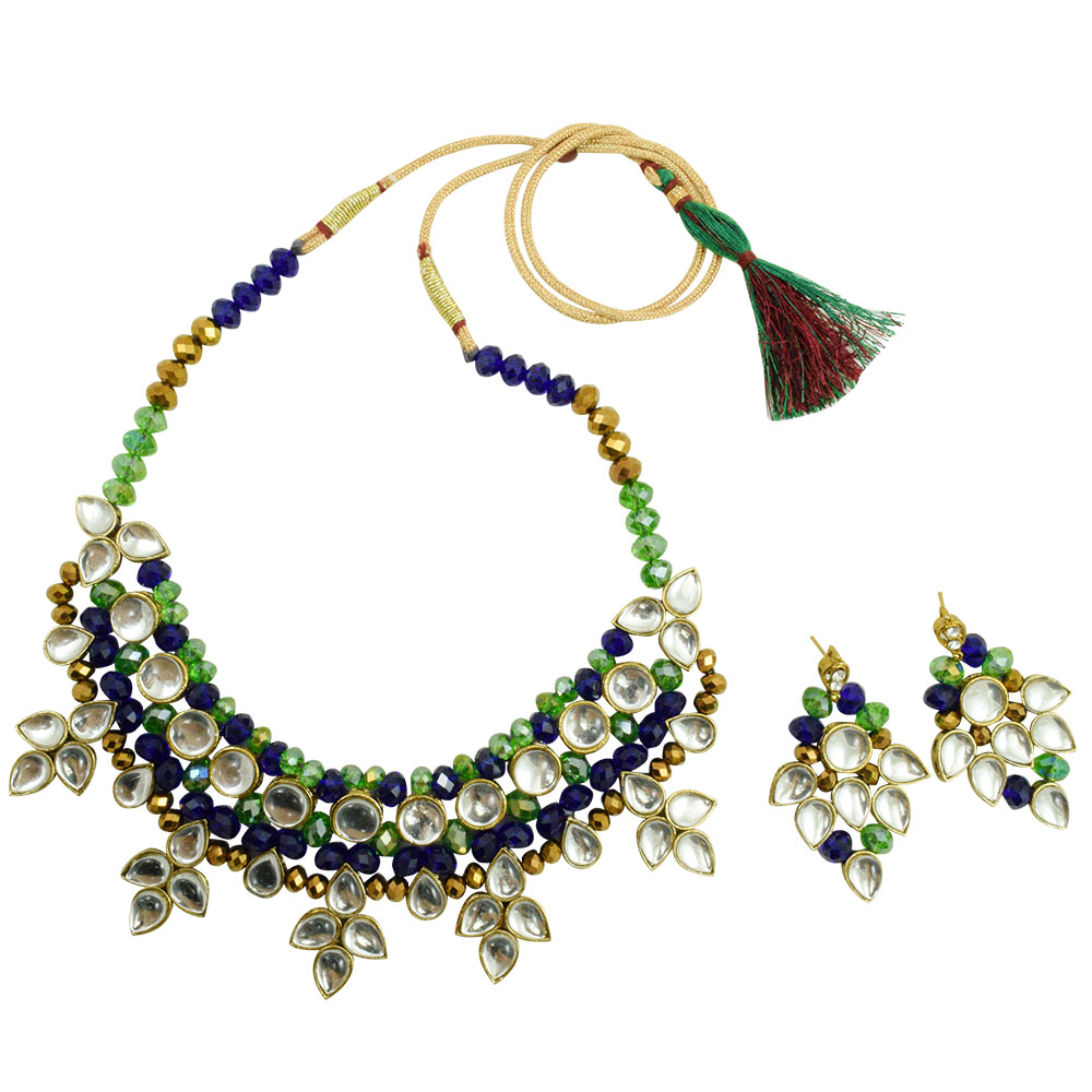 Get this alluring floral kanthi haar necklace set and adorn your delicate neckline. Pair it with parrot green or blue-colored traditional attire and dazzle the show. This exquisite green-blue kundan set will surely add a bright accent to your ensemble and give you a lush look. Are you ready to be the talk of the town?