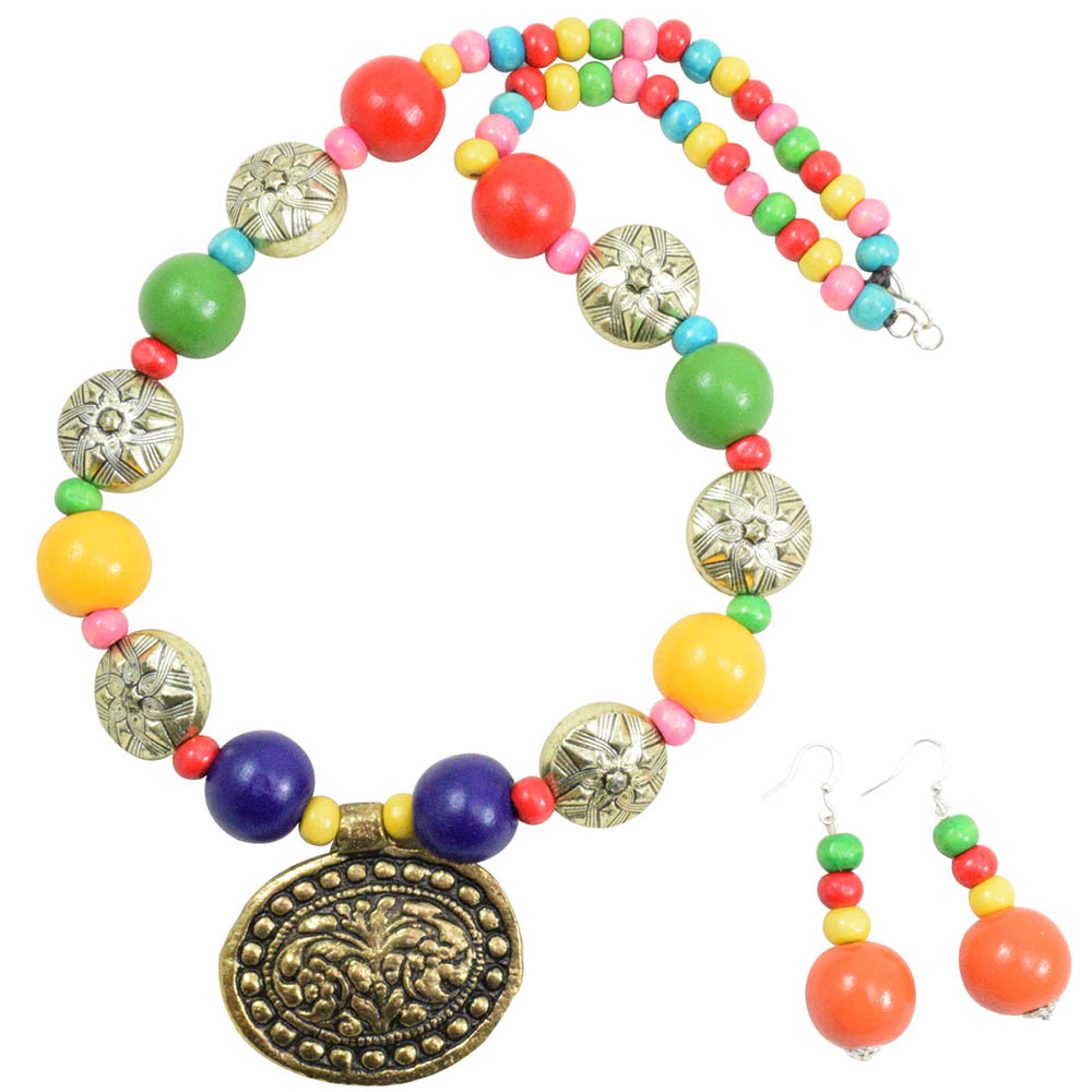 Round beaded necklace can go well with almost any attire. This necklace, mostly containing round beads, goes well on attire of any color. It has been made using beads of various colors. Round beads, both small and big, have been used to make this enchanting piece. It can help you stand out in the crowd. The metal pendant is unique and adds to the richness of the necklace. To add variety to the necklace, silver metal beads with flowery design have also been used. The earrings mainly contain the beads and can be worn on almost any attire. Whether it is traditional, fusion, or western attire, the earrings can be worn. For traditional and fusion wear the entire set would be apt.