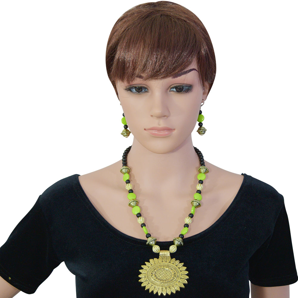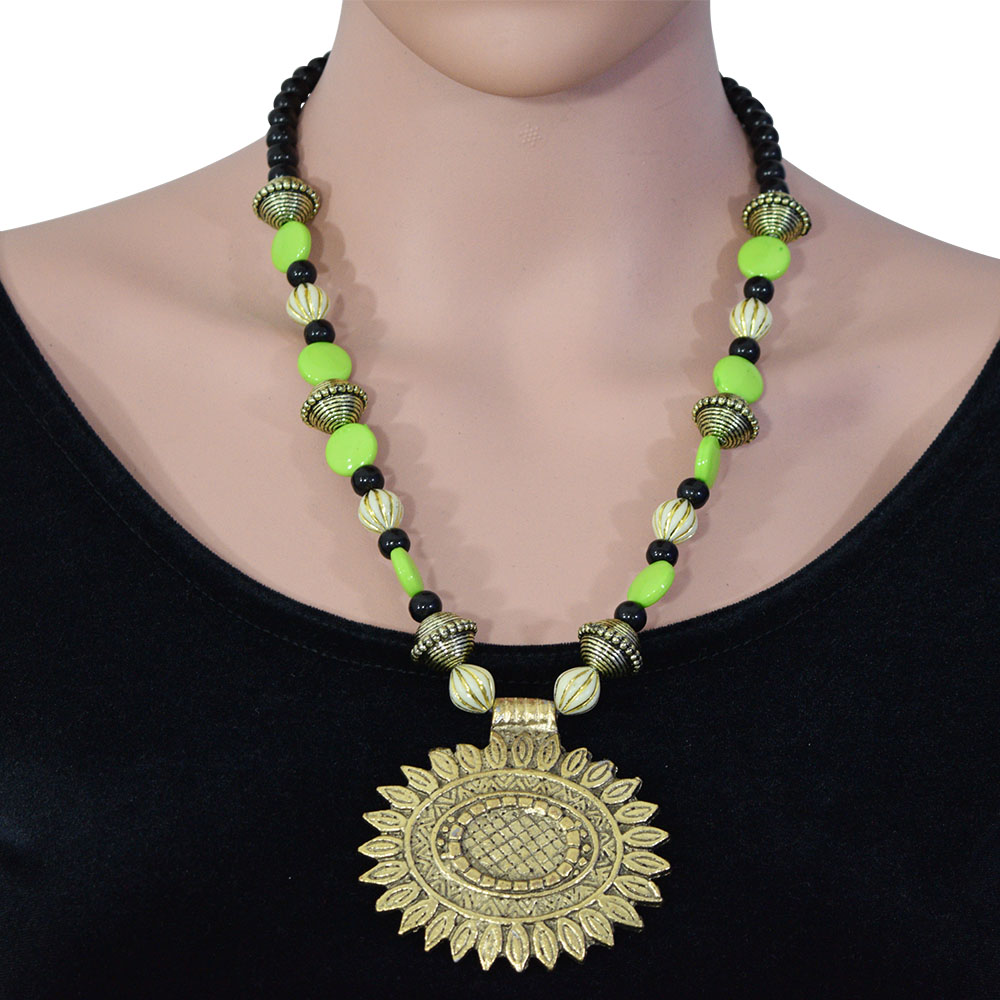 This spectacular antique-finish beaded necklace set adds more grace to your look. The sheeny gold tone, interlink green bead and black enamel on this pendant set looks lovely. The best thing about it is that you can wear it with both western and ethnic wear. So, add it to your vanity before it gets too late!