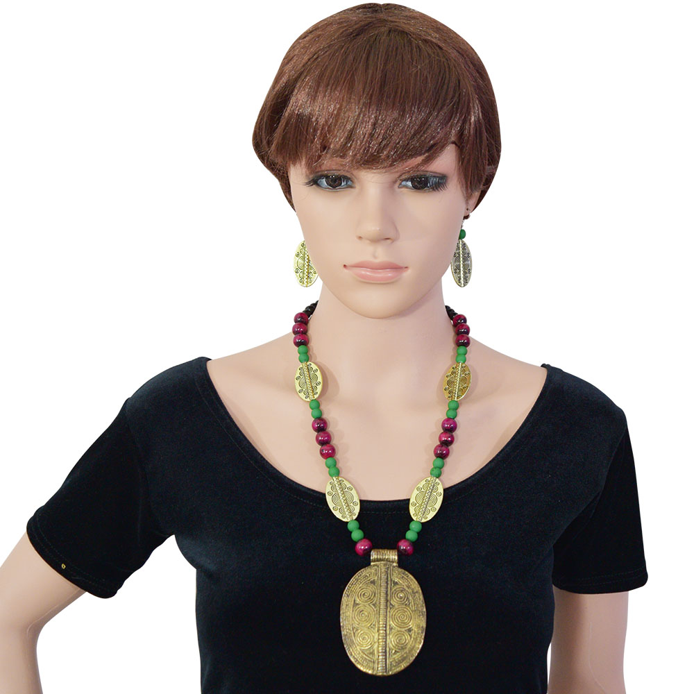 Woo your lady love with this bold gothic print and traditional accent style pendant set. The chunky chain is studded with red and green beads which meets the antique style pendant in the center. The scintillating necklace comes with a pair of hanging matching earrings which she can team up with any party or regular outfit.