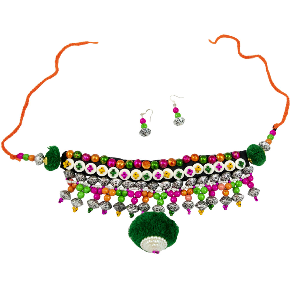 Want some beads to work with pom pom in your necklace? Grab this necklace now. An amazing product from Fashionvalley is perfect for a Navratri outfit. You must be looking for all the jewelry to adorn with your outfit in Navratri. Fashionvalley is your one-stop for Navratri jewelry. Like this necklace and earrings set made from green, pink, and orange bead with some oxidized work. A heavy set with sober earrings makes a perfect match!