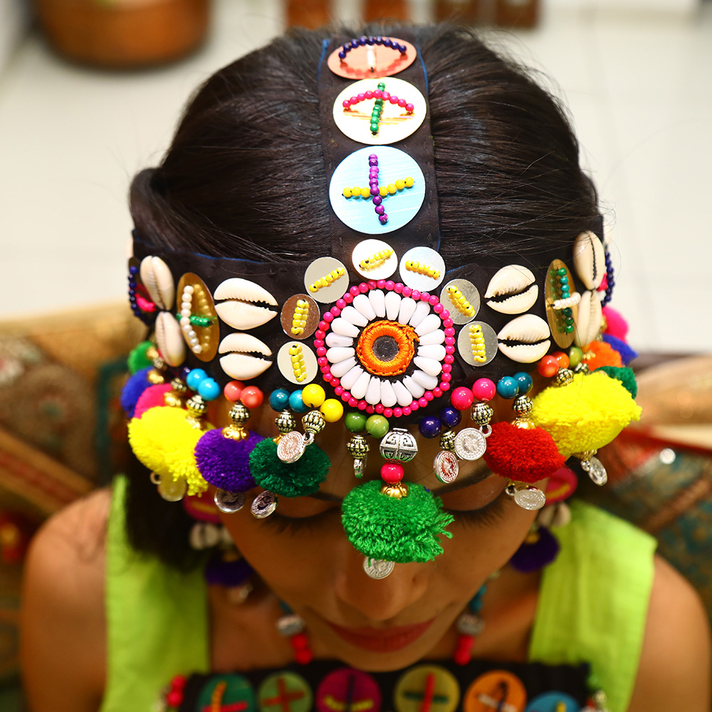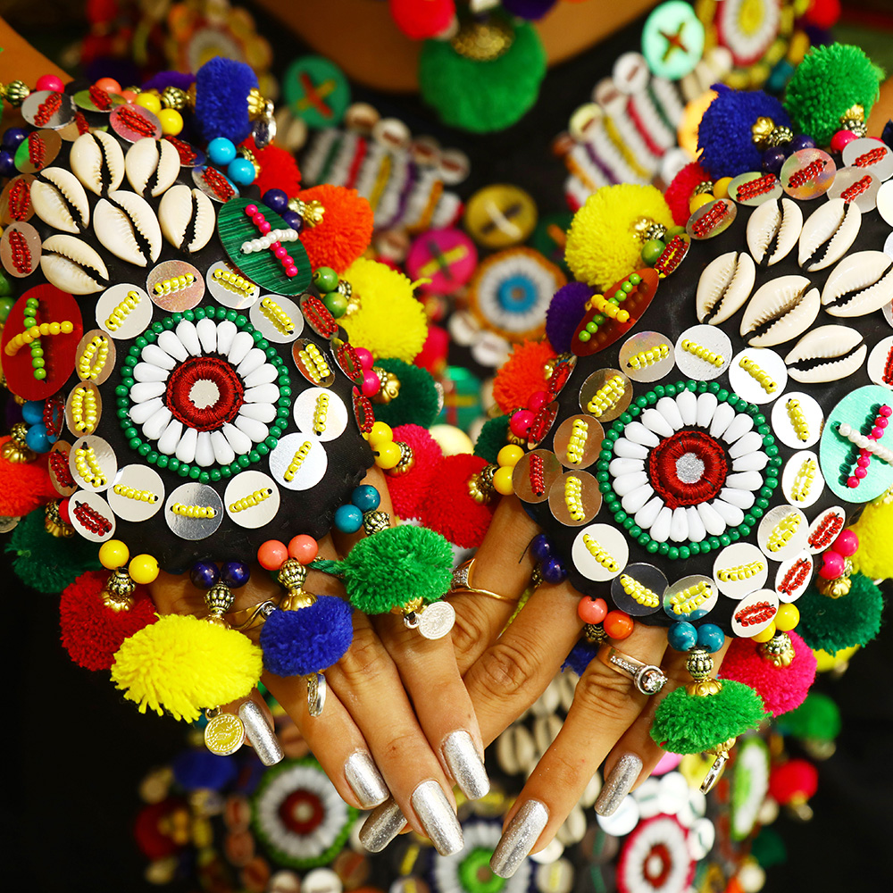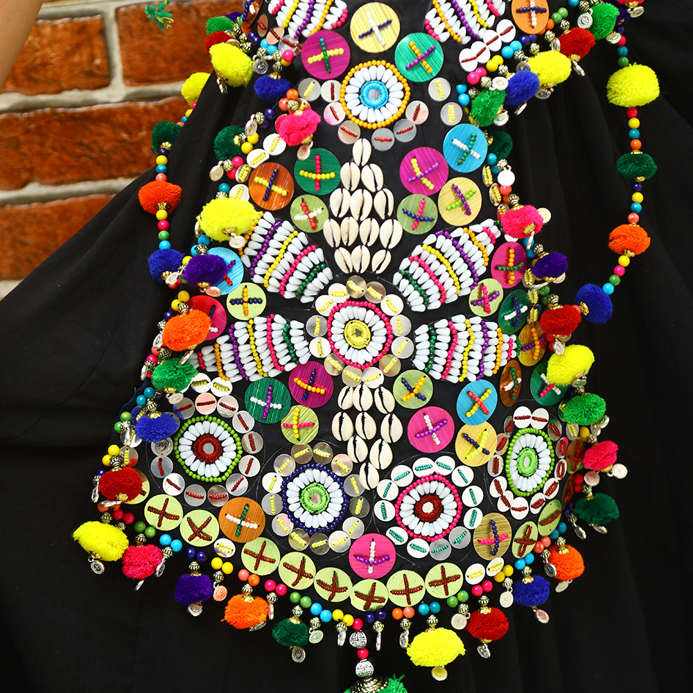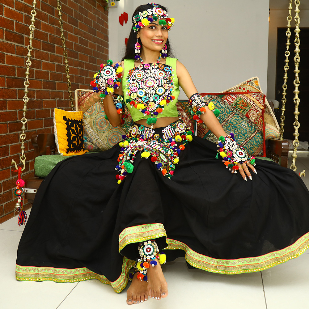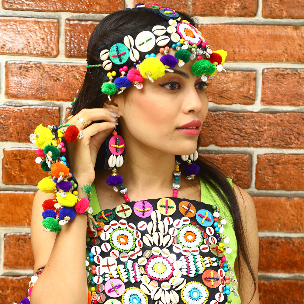 Why do we have to go to the market and look for the matching maang tikka, handpieces of jewelry, and leg pieces of jewelry when we have a solution for you? A complete set for chaniya choli irrespective of your chaniya choli style. This entire set can also be worn for styling your Navratri look. it is a custom-made designer Navratri jewelry. Work of embroidery and seashell beads can style your outlook the way you want to. So what are you waiting for?