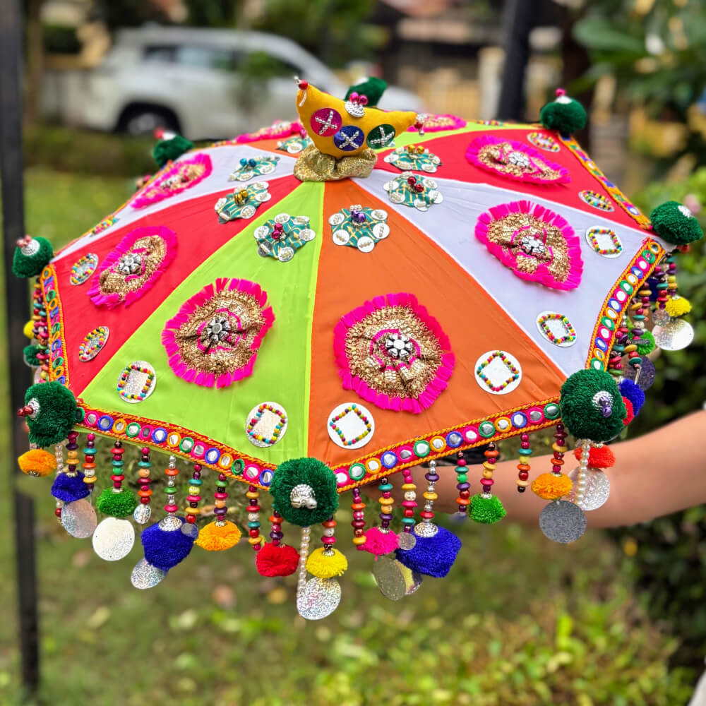 This eye-catching Navratri umbrella glows with bright panels of green, red, orange, and white, decorated with stunning mirror clusters, pink embroidered patches, and traditional motifs. The center features a charming handcrafted parrot, while colorful beads and pom-poms add playful movement around the edges. Ideal for Garba nights or as a statement decor piece, it beautifully celebrates the richness of traditional folk art.