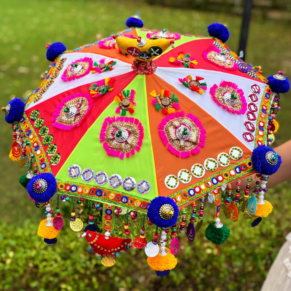 This festive umbrella delights with panels of red, orange, white, and bright green, beautifully decorated with pink and gold embroidered patches, mirror circles, and small floral motifs. Accented by bold blue and yellow pom-poms and vibrant bead hangings, it adds playful elegance to Navratri celebrations. Perfect as a Garba accessory or eye-catching decor, it celebrates traditional craft with colorful charm.