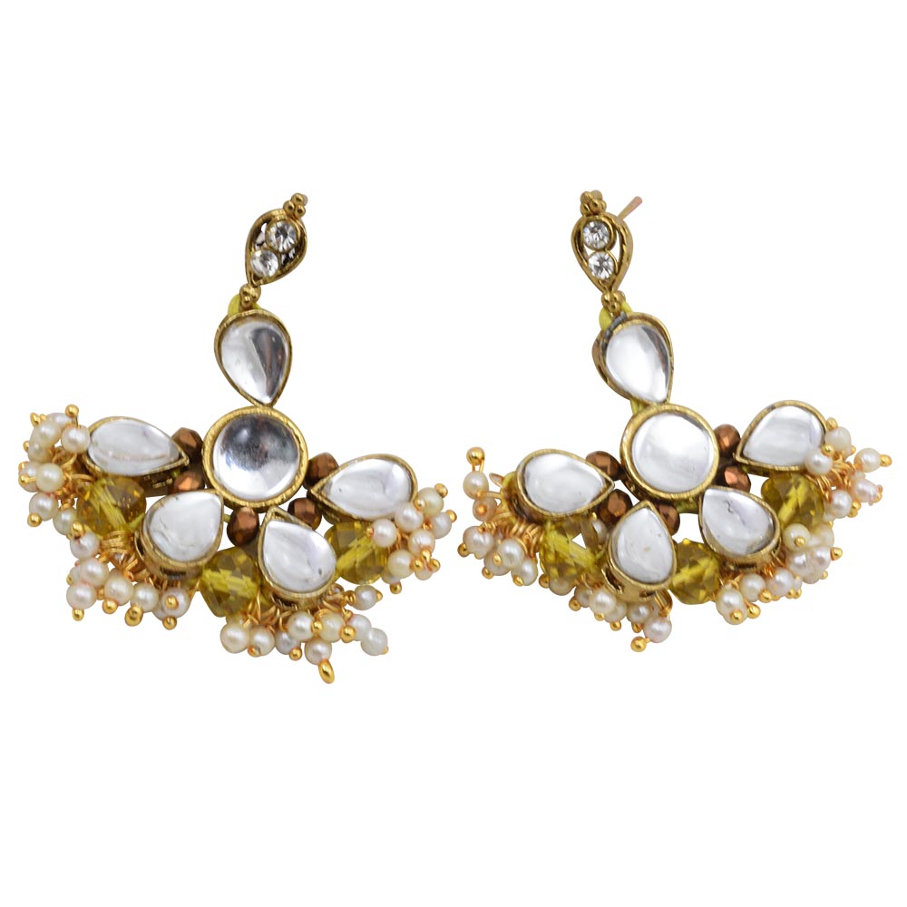 Dazzle the show with this antique finish mirror-work kundan necklace set. To complement your look, this necklace will come with a pair of the same patterned earrings. The necklace exudes class because it covers the entire neckline. You can easily wear it with any black, white or yellow-shade traditional outfit and watch the compliments flow.