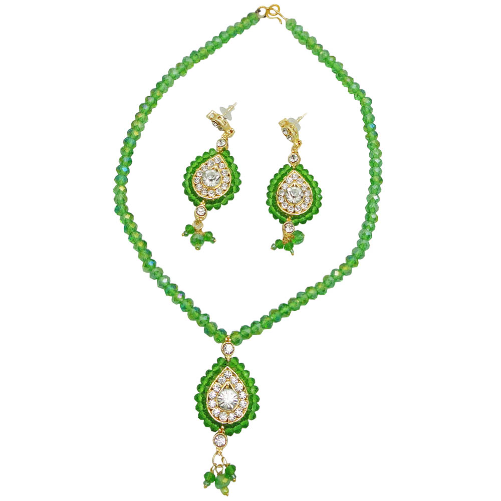 A simple and modest grass green crystals chain that is arranged in a single row where the small pear shaped pendant with white stones in the center adds extra detail to the jewelry. Small hangings beneath the pendant looks pretty even though the detail is just a minor one. The similar design earring matches the jewelry so beautifully well and will make you look very simple, pretty and traditional as this indian jewelry is one of the oldest designs that never runs out of style.