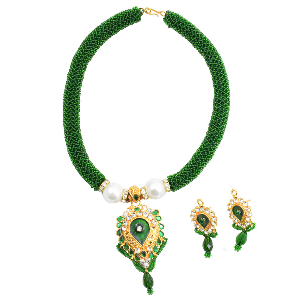 This beautiful mehndi green handmade necklace gives you the right look for any traditional occasion such as marriage, pooja, or baby shower. You can adorn this set with attire having plain white or dark color. It can go well with green attire. The pendant is made to shine with stones studded in it. The leaf shaped pendant looks beautiful as it has been decorated using crystal beads, and glittering stones. The necklace is accompanied by a set of earrings. The design of the earrings is akin to that of the pendant of the necklace. The addition of white pearls adds contrast to the set and makes it look rich.