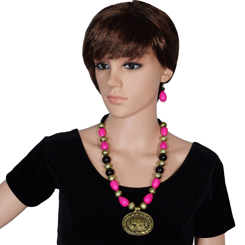 Blending beads of different variety, this enchanting necklace gives you a sophisticated look. Made using designer beads, it suits any multi-color attire very well. Dark pink and black are the dominating colors of this necklace. The silver colored beads with carved design give it an antique look. This necklace rightly depicts the traditional as well as modern values. It presents the necklace wearer as the one who likes to embracing the modern culture while sticking to the traditional value system. The antique pendant is embedded with the image of an elephant and becomes the center point of attraction of the necklace.