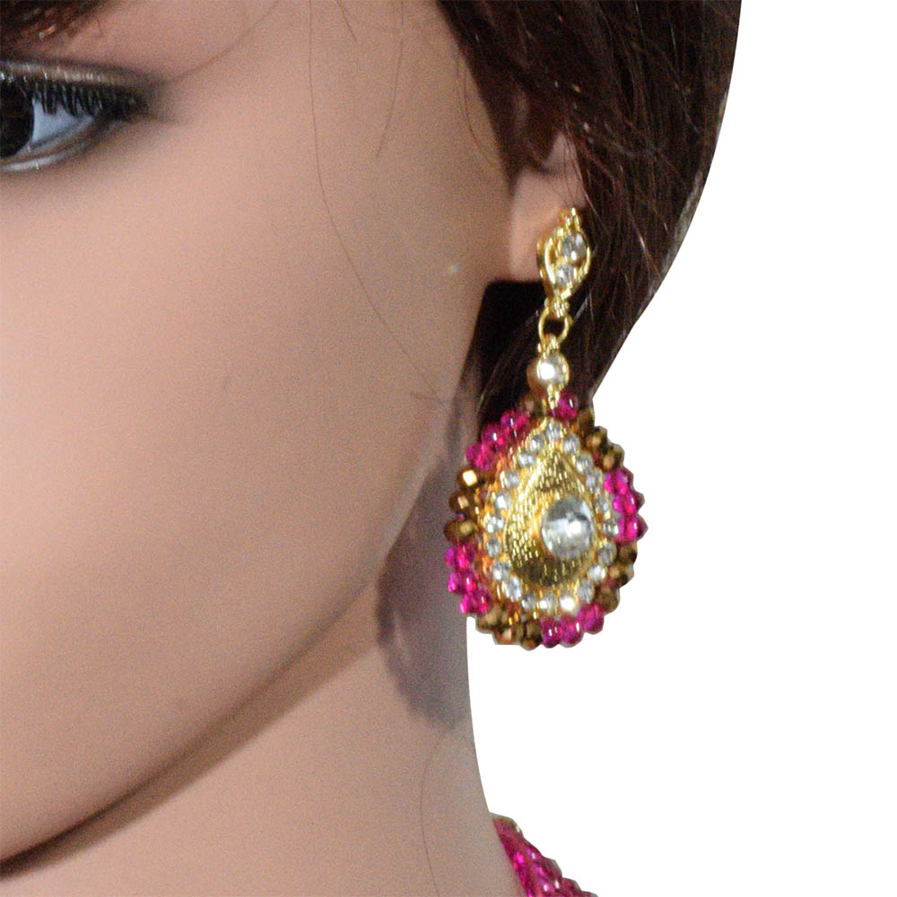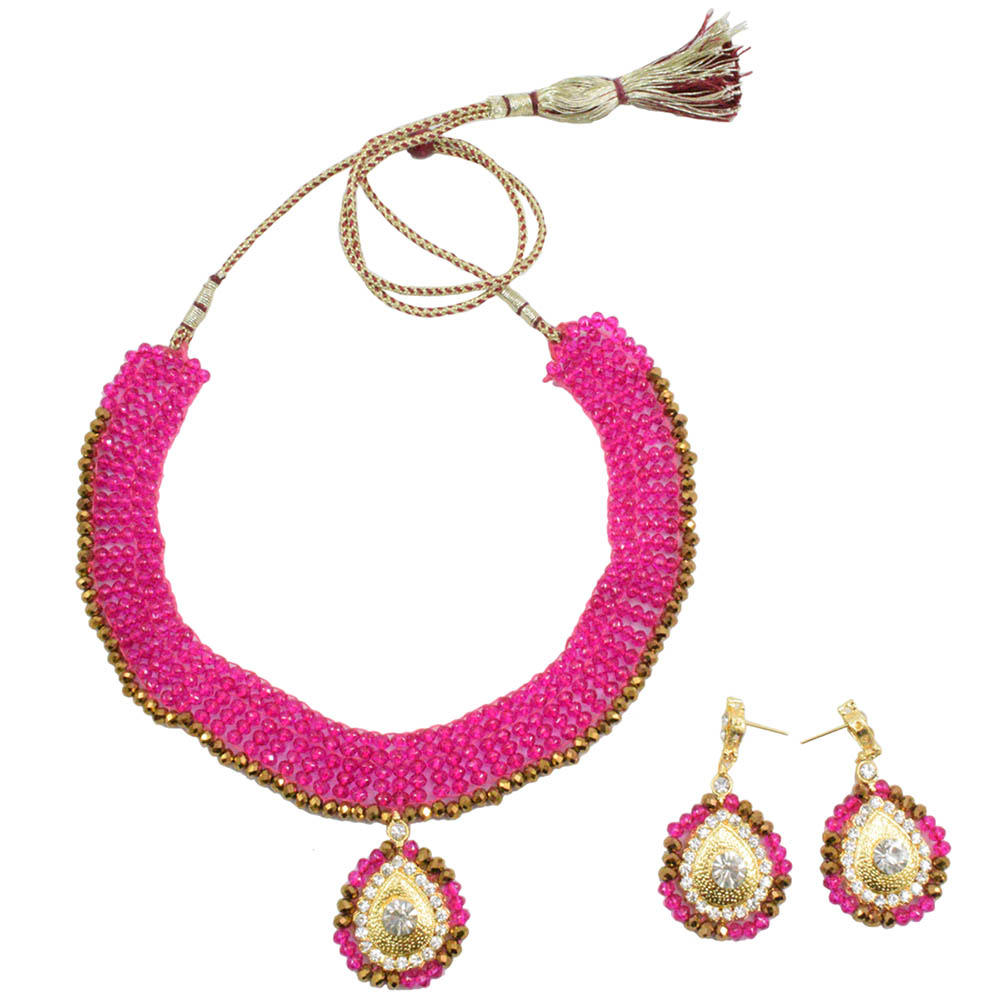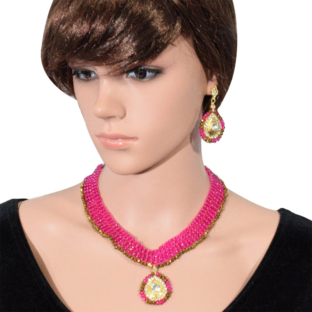 This pink colored handmade set made using crystal beads looks perfect on any traditional occasion. You can adorn this set on attire of pink color. It may also add good contrast to white colored traditional attire having hues of brown. The leaf shaped pendant adds to the beauty of the necklace. The earrings accompanying the necklace have also been given the same design as that of a pendant. The necklace looks rich and can accentuate your look if you are wearing simple attire. It is a type of short necklace whose length can be adjusted using the rope given to tie the necklace.