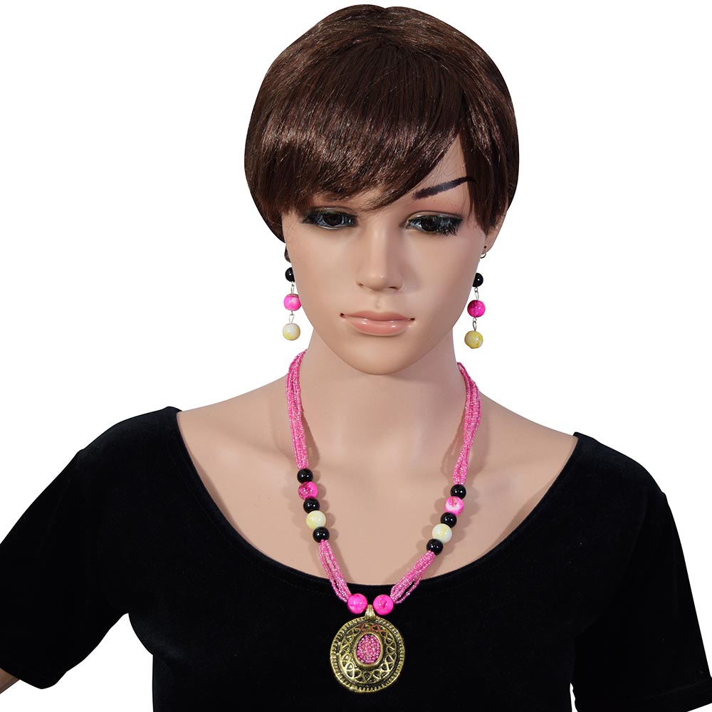 Fashionvalley, the top seller of a la mode chunky handmade jewellery has designed this sumptuous pink jeko moti beaded necklace set. The multi-layered necklace has a heavy metal antique-finish pendant in the centre and is complemented by dangling earrings. Wear it daily and you are ready for a fashion-forward look. There is no denying that as you flaunt this swanky piece of jewellery, you will be loaded with compliments. That is why Fashionvalley is recognized as the jeweller for TODAY's WOMEN till date.