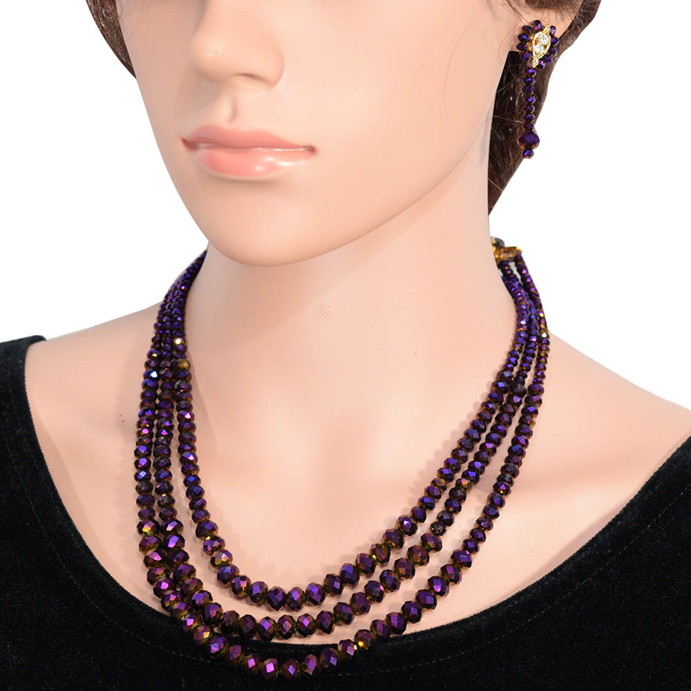 Purple is the in color these days. This beautiful purple necklace comes with three strings of purple beads which sparkle to display multi-colors. The necklace is made using both small and medium sized purple beads. You can manage the length of the necklace using the rope given to tie and untie the necklace. The heaviness of the necklace is balanced by keeping the earrings simple. However, the earrings have been studded with two shining stones in order to add sparkle to the set. You can wear this set at traditional occasions on traditional attire of any color.