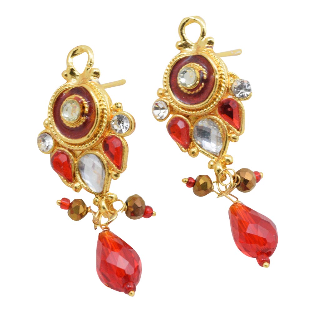 When you are looking for designer jewellery that can add glamour to your style, this is the place! You have landed at the right spot. This exquisitely crafted red bead necklace has a flower-shaped pendant in the centre. To further enhance the beauty of this product, the necklace comes with same-styled drop earrings. You can flaunt this traditional necklace with a yellow or any light shade ethnic wear.