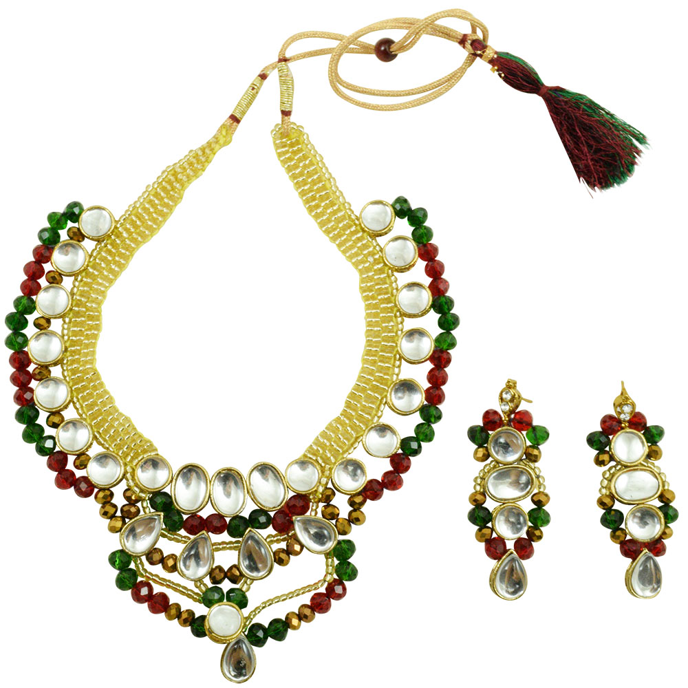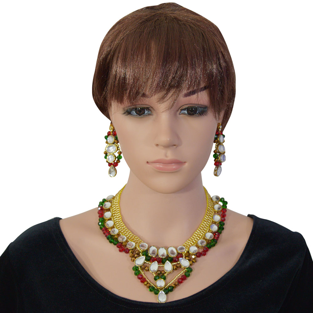 Fashionvalley brings you the traditional classic themed red and green necklace set. Irrefutably, these two colors are the colors of all the seasons. The well-crafted jeko beads along with kundan work add sparkle and accentuate your look. So, what are you waiting for? Grab this heart-warming colorful design now!