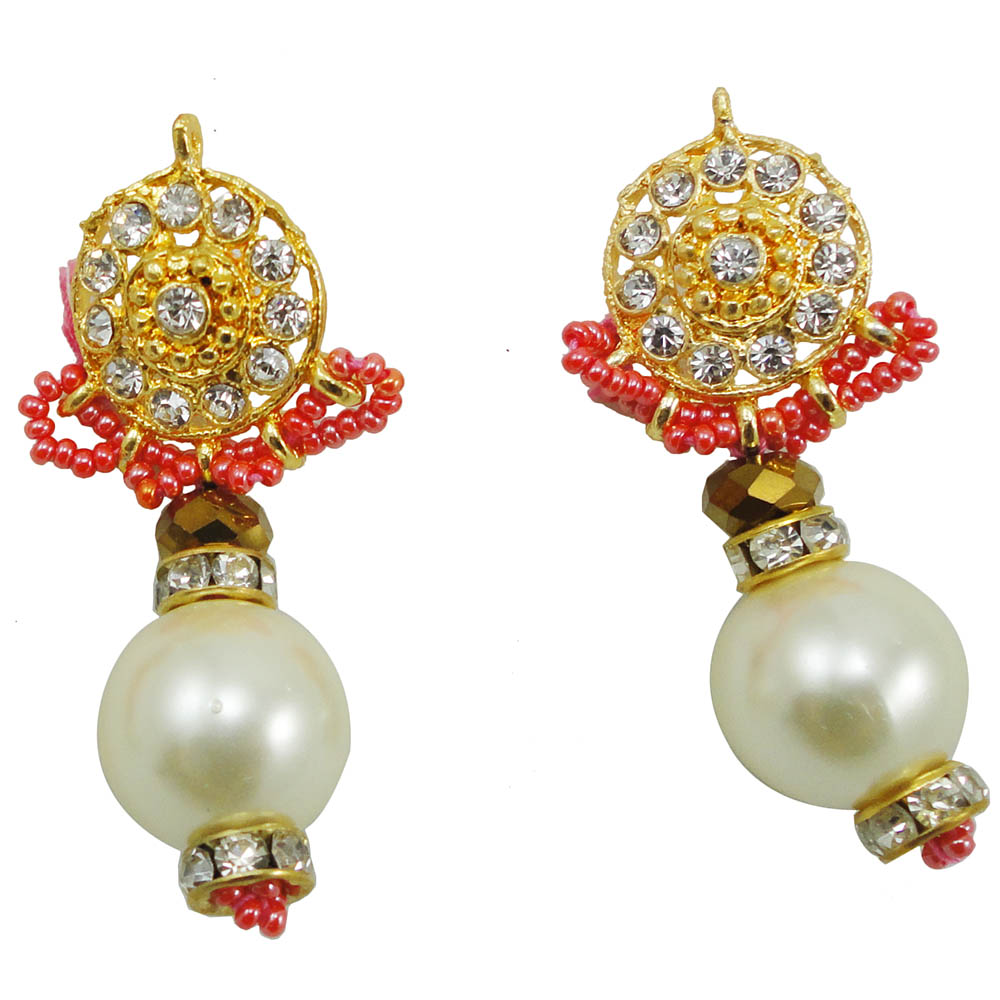 Dark peach colored beads have been used to make this elegant set. Henna colored small beads have also been included. This rich set goes well with traditional attire of any color. You can wear it on any occasion including a marriage or anniversary party. The round pendant, studded with diamond stones, makes the entire set glitter. The earrings have the small version of the pendant and also shine as you move your fingers through your hair to make way for them to show their glory. The white pearl shaped beads added amid the necklace make the entire set look chaste.