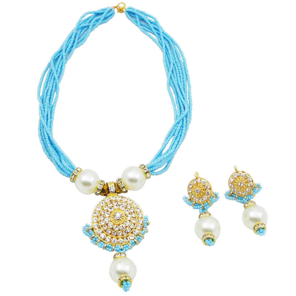 Serenity overtakes your mind as you glance at this set and adorn yourself with it. Made with sky blue colored small beads, it looks heavy. The pendant, with stones studded in it, makes the necklace an exceptional peace. The white pearls enhance the calm feeling that this necklace offers. The design of the pendant and earring are similar.