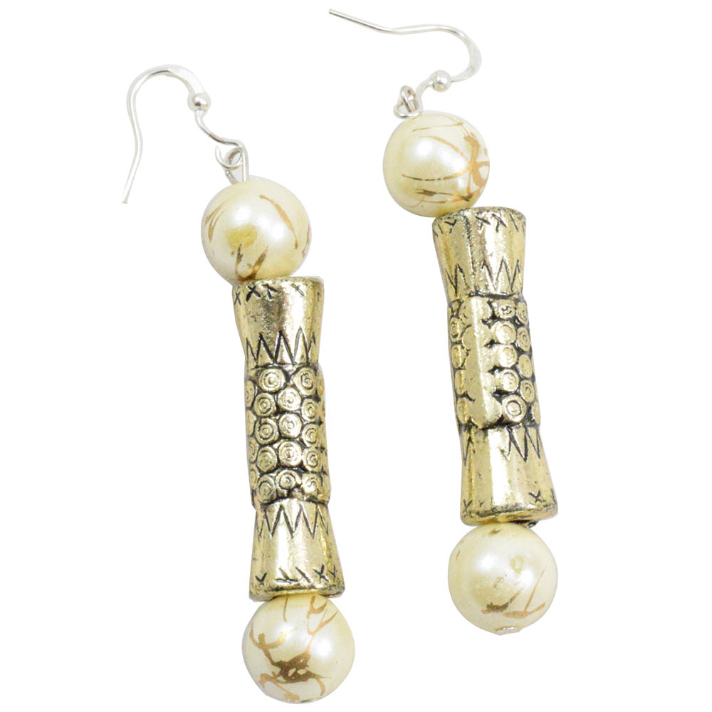 An era peeps from this enchanting handmade necklace which reminds of the ancient jewelry. During those times, simplicity was much appreciated and respected. This white beads necklace reflects simplicity with style. It comes with a metal pendant with design imprinted in it. The pendant resembles the shape of a flower. Two other metal beads, long and cylindrical in shape, have also been used to add to the beauty of the set. They are of silver color. The necklace is accompanied with a pair of earrings. This set can go well with attire of any color, especially the ones with dark hues. You can adorn yourself with it while wearing fusion outfits.