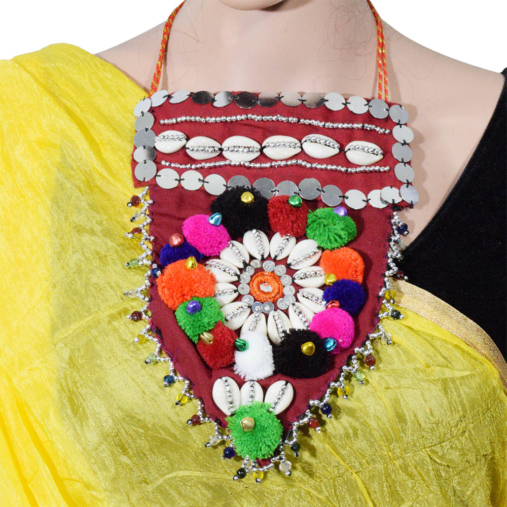 Make your Navaratri special by adorning yourself with this necklace which completes your truly authentic Navaratri look. Made using cowrie shells, this special piece also comes with colorful woolen balls and small beads. The circle beads made using mirror cloth make the piece shine and glitter as you enjoy the dance moves this season. The shape of this beautiful necklace, first straight and then triangle, is unique and goes well on attire of any color. Just go for it!