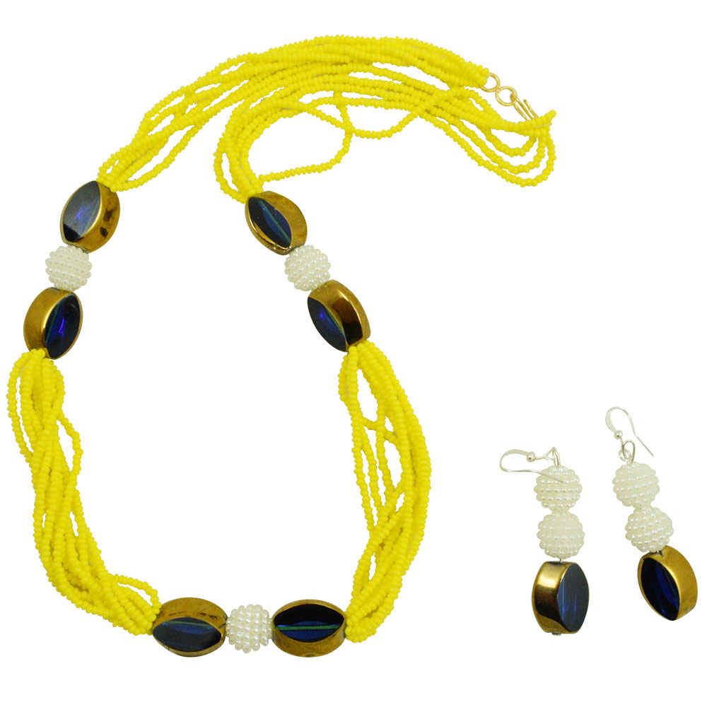 Yellow, the lightest and brightest color is said to spread happiness around! Now, you too can spread happiness around by wearing our classic beaded yellow necklace set. Well, if you wear anything black with this set, that will be a universal taker, but you can team it up with any light shades too. You will look fab and your friends will vouch for it too. Hurry! The product is available till the stock lasts.