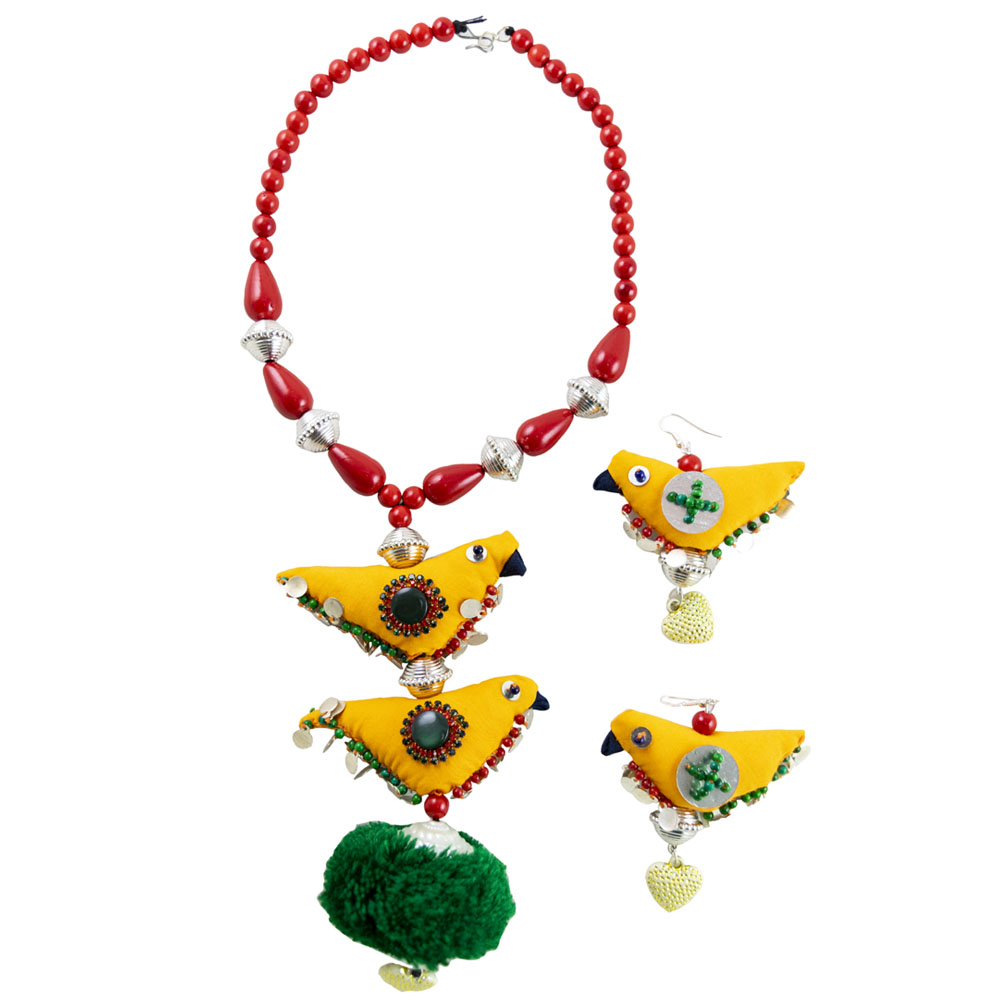 Looking forward to buying something unique this Navratri? We have Yellow Parrot Style Designer Necklace Set in stock ready for you for this Navratri. Made up of colorful beads and designer items, this garba necklace looks extremely stunning and unique when worn with any traditional or ethnic outfits. This handmade necklace for Garba is available in yellow, red and green colors. The necklace has yellow parrots fitted which make it a designer necklace. The navratri necklace set contains 1 Necklace and 2 parrot-shaped Earrings, available at pocket-friendly price. Buy this necklace for chaniya choli and let people gaze at you!